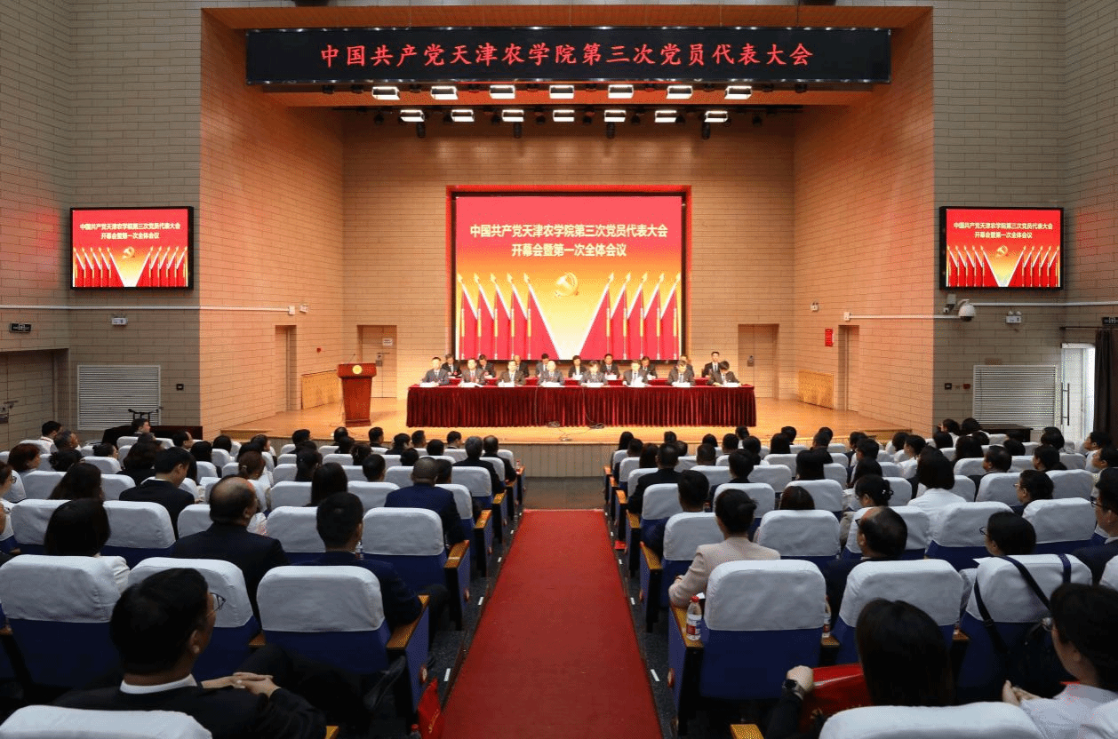 大会会场雄伟庄严、气氛热烈。会场悬挂着“以习近平新时代中国特色社会主义思想为指导,全面建成特色鲜明优势突出的高水平农业大学”的标语。