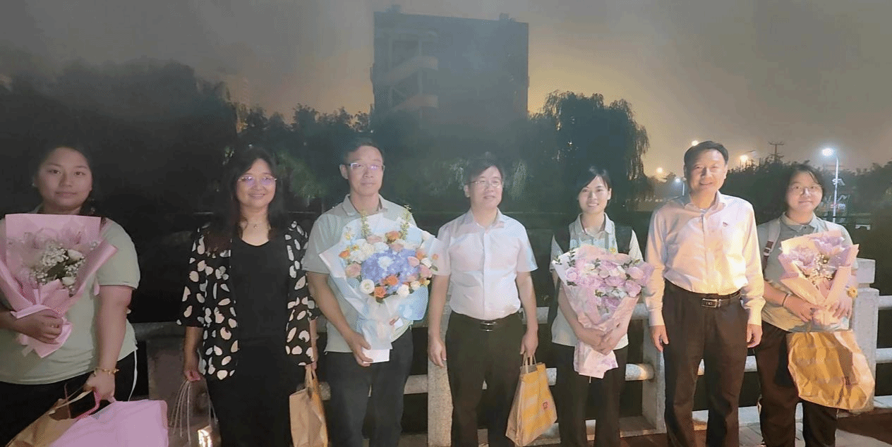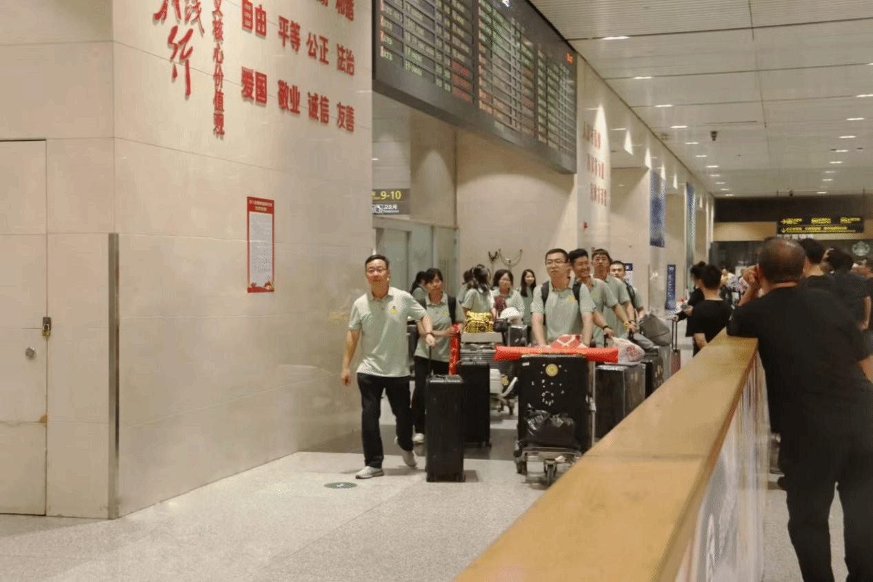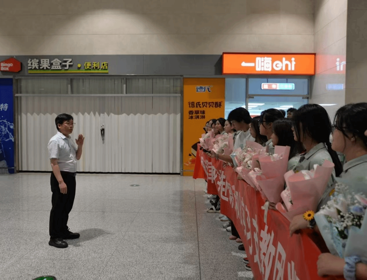 当支教师生们走出航站楼,迎面走来的学校领导老师们向支教团成员献上了鲜花,并致以亲切的问候。现场举行了简短但又热烈的欢迎仪式。