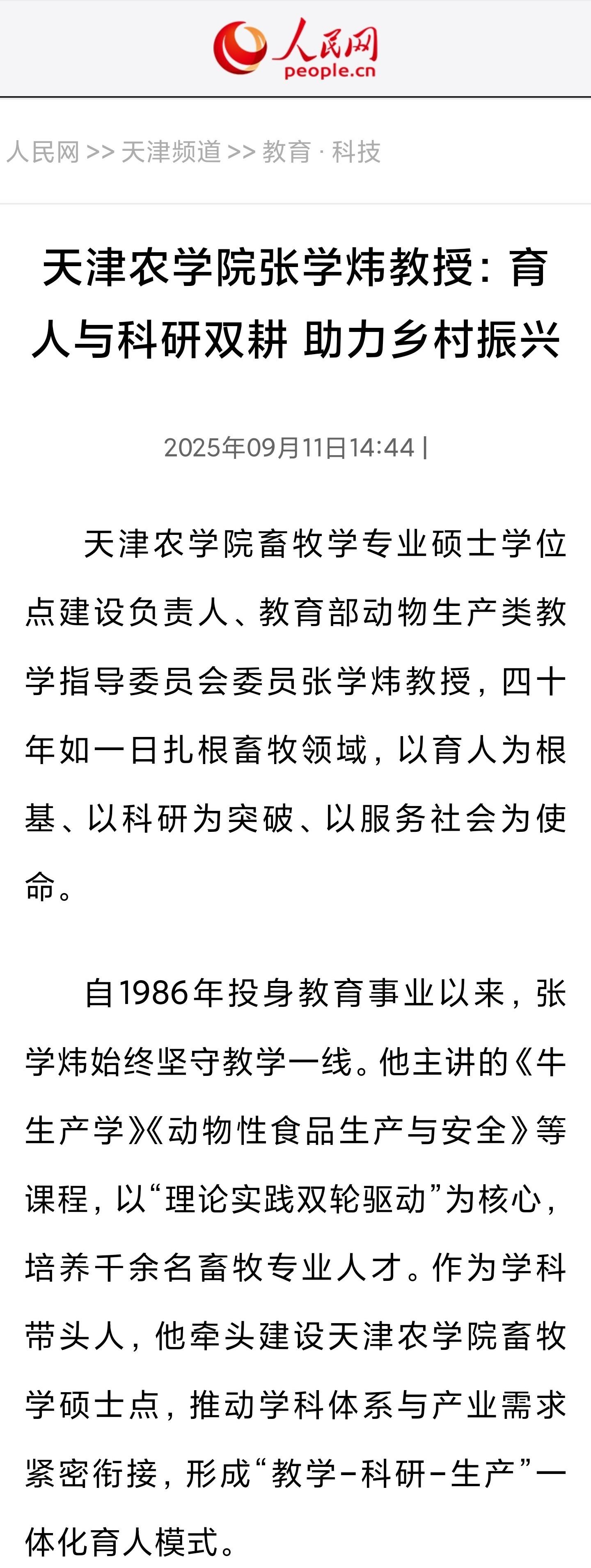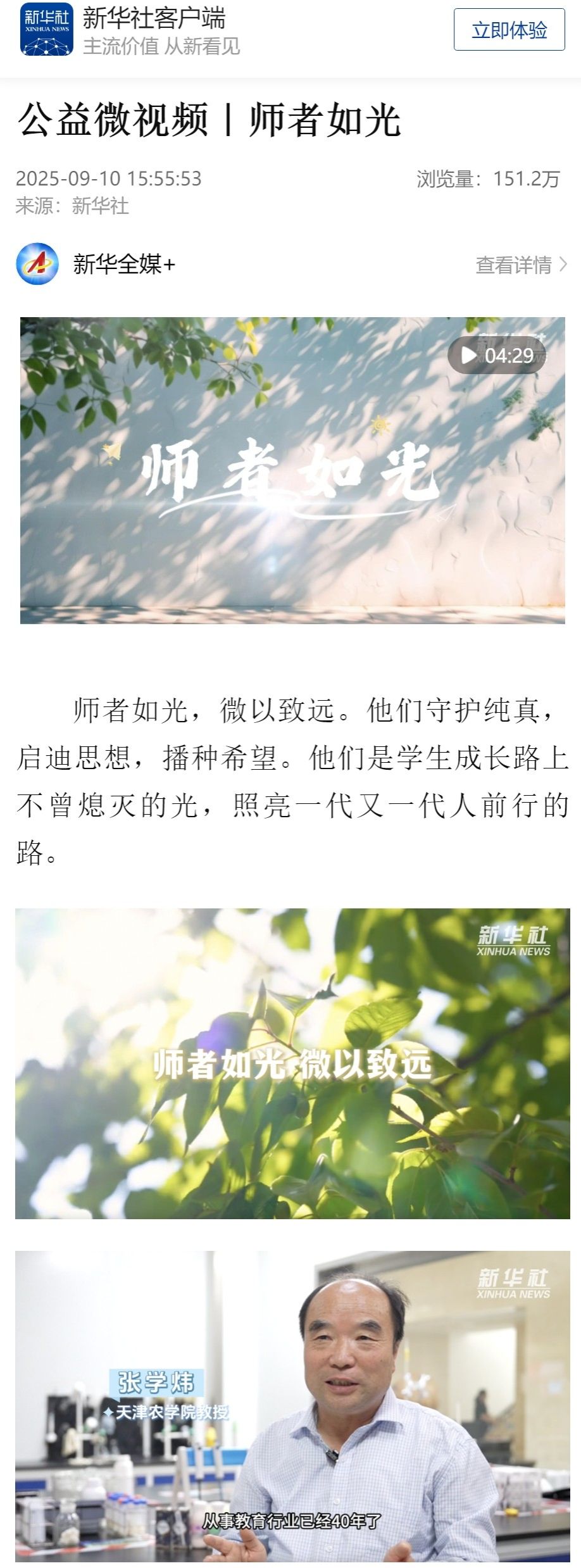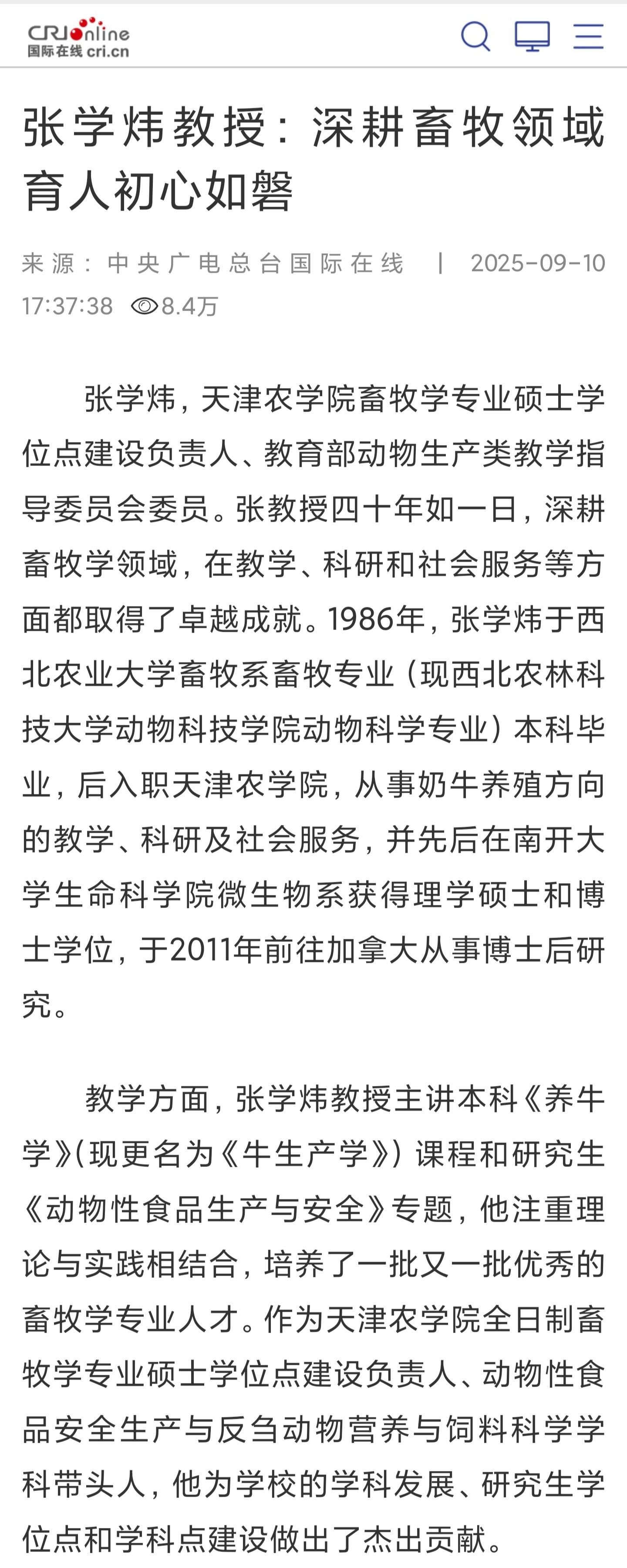 连日来,在第41个教师节到来之际,新华社、新华网、中央广播电视总台国际在线、人民网、天津日报视频号、天津广播电视台、津云、津门教育等多家主流媒体在“教师节专题新闻”中持续对365官网动物科学与动物医学学院张学炜老师教书育人工作进行了矩阵式报道,产生了较大的社会影响力。