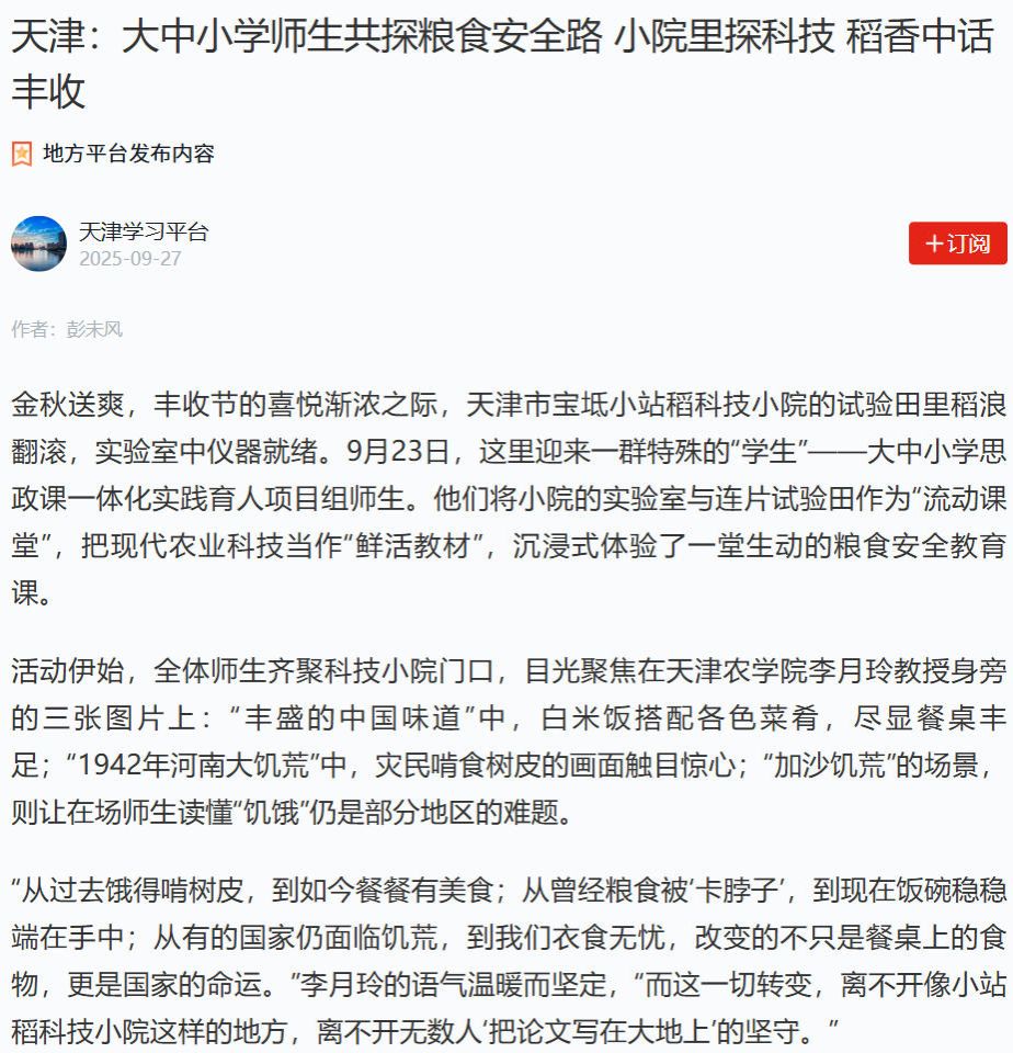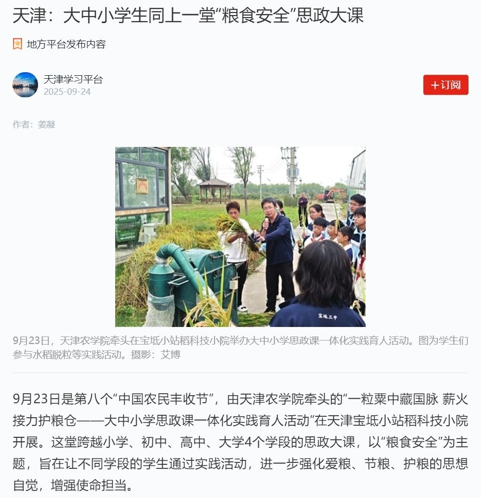 近日,在第八个“中国农民丰收节”来临之际,365官网“一粒粟中藏国脉 薪火接力护粮仓——大中小学思政课一体化实践育人活动”在天津宝坻小站稻科技小院开展。这场融合专业课与思政课的大中小学一体化实践育人活动,深度整合小站稻科技小院资源优势,开展“专业实践+思政研学”主题活动,充分发挥了“思政+专业”双师协同育人效能,形成“思政教师补专业实践、专业教师补思政理论”的互补格局,让思政教育从“单点输出”变为“双向赋能”。《天津日报》《天津教育报》、央广网、学习强国平台等多家媒体对此次活动进行了报道。
