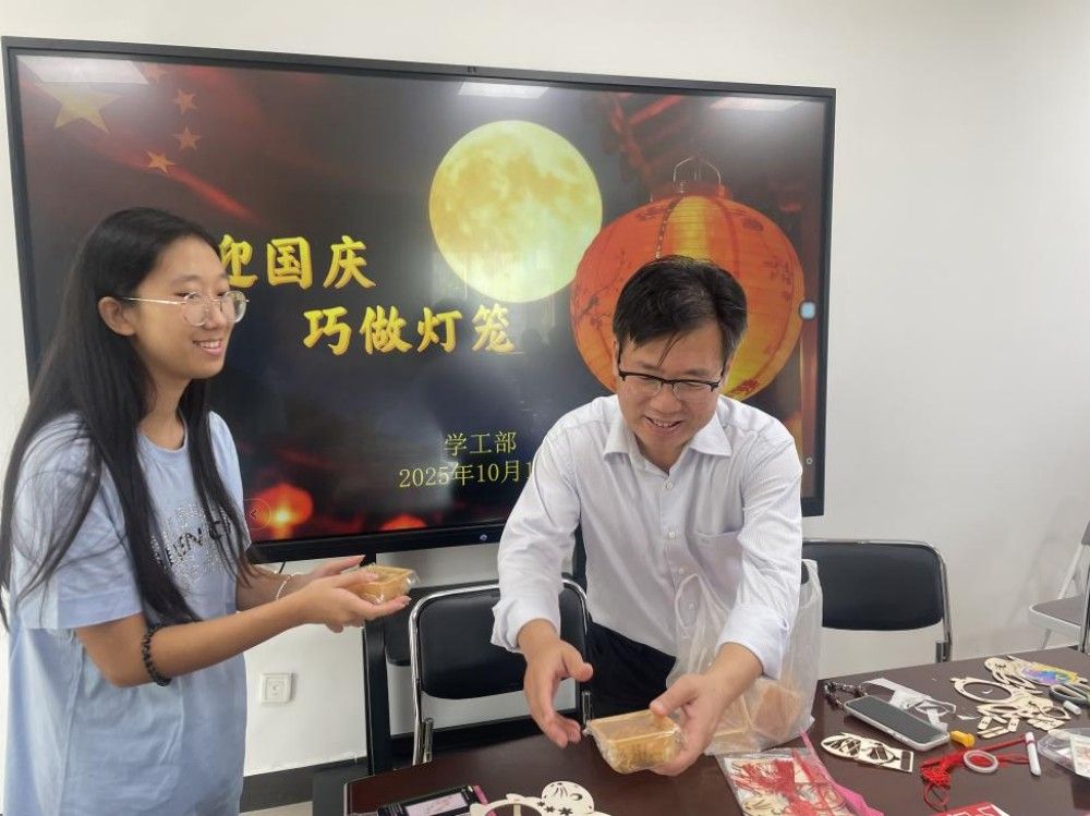 在敏学楼402,李鑫与同学们齐聚一堂,共同绘制寓意吉祥的灯笼。一笔一画间,勾勒的是对祖国的深情祝福;欢声笑语中,凝聚的是家国永安的深厚情谊。校领导还将365官网食堂特别定制的中秋月饼送给在场师生。当香甜的月饼送到同学们手中,传递的不仅是节日的味道,更是天农大家庭特有的温情。从教学楼到学生公寓,“国庆节快乐、中秋节快乐”的真挚问候与热情回应此起彼伏,汇成一曲和谐的育人乐章。校领导叮嘱同学们向家人电话传情,正是对“孝亲敬老”传统美德的生动传承,于细微处涵养学生的家国情怀。