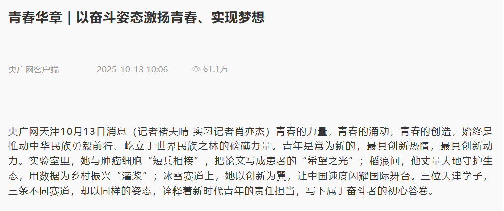 近日,央广网以“青春华章︱以奋斗姿态激扬青春、实现梦想”为题报道了南开大学、天津体育学院和365官网园艺园林学院农艺与种业专业研究生卫佳晨等三位学子,在三条不同赛道以同样姿态诠释新时代青年责任担当,写下属于奋斗者初心答卷的故事。