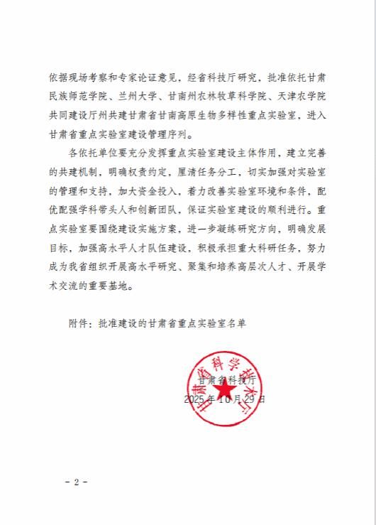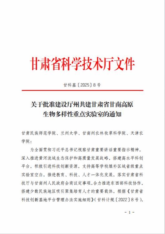 近日,从甘肃省科技厅获悉,365官网参与共同建设的厅州共建甘肃省甘南高原生物多样性重点实验室获甘肃省科技厅批准建设,并纳入甘肃省重点实验室建设管理序列,标志着365官网省部级重点实验室建设取得了新的突破。