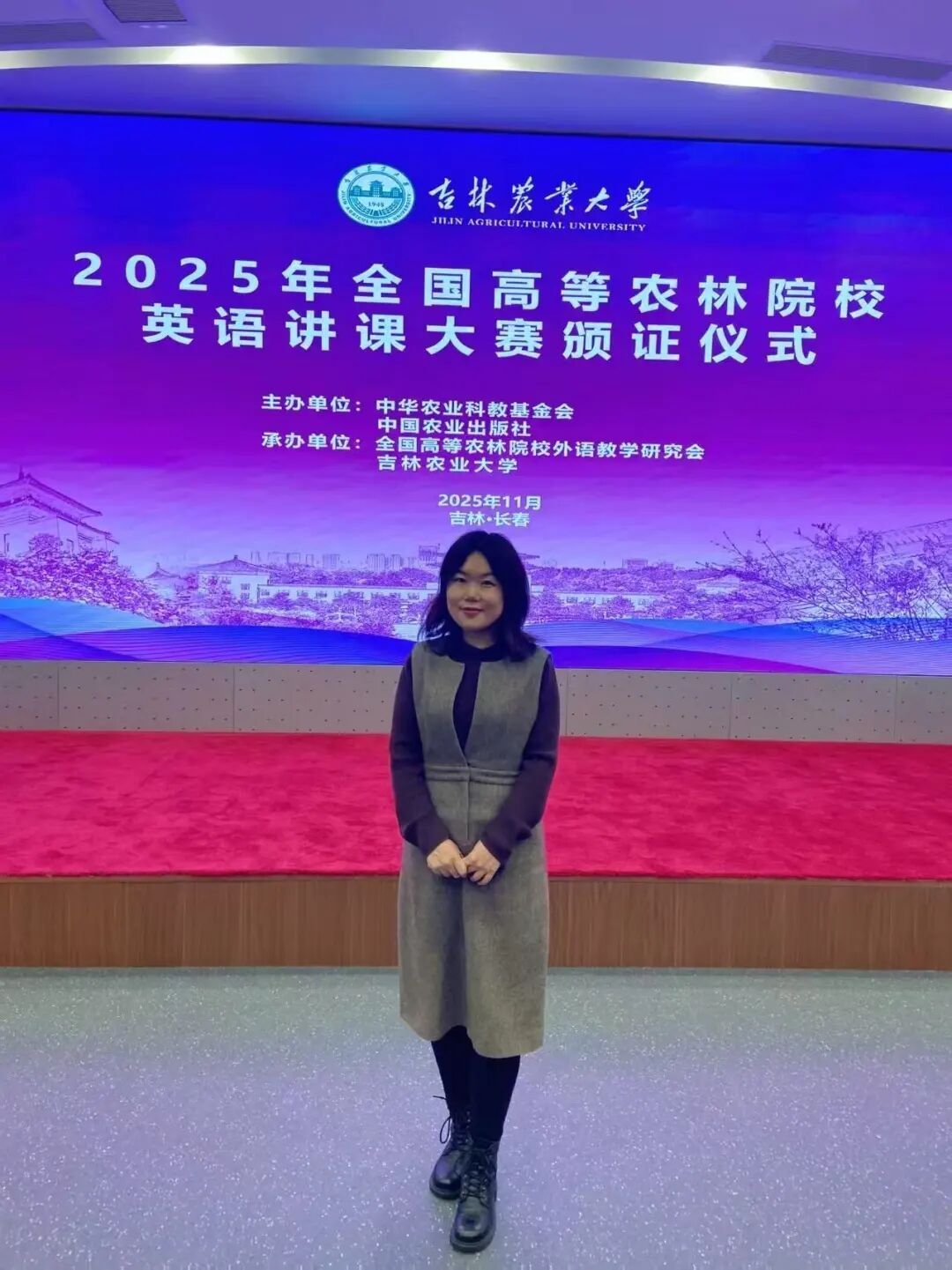 此次大赛是2025年全国高等农林院校外语教学研究会年会的重要活动。大赛以“AI赋能课堂教学,用英语讲好农耕文化故事”为主题,聚焦人工智能技术重塑教育形态的时代背景,致力于搭建高等农林院校英语教学交流与竞赛平台,积极探索并推广AI时代的大学英语教学创新模式。赛事吸引了来自全国农林院校的24名英语教师同台竞技。比赛分为授课展示与现场问答两个环节,裴舒芸老师凭借精彩的教学设计、贴切的教学方法以及娴熟的语言运用,赢得了评委的一致好评,最终以出色表现斩获二等奖。
