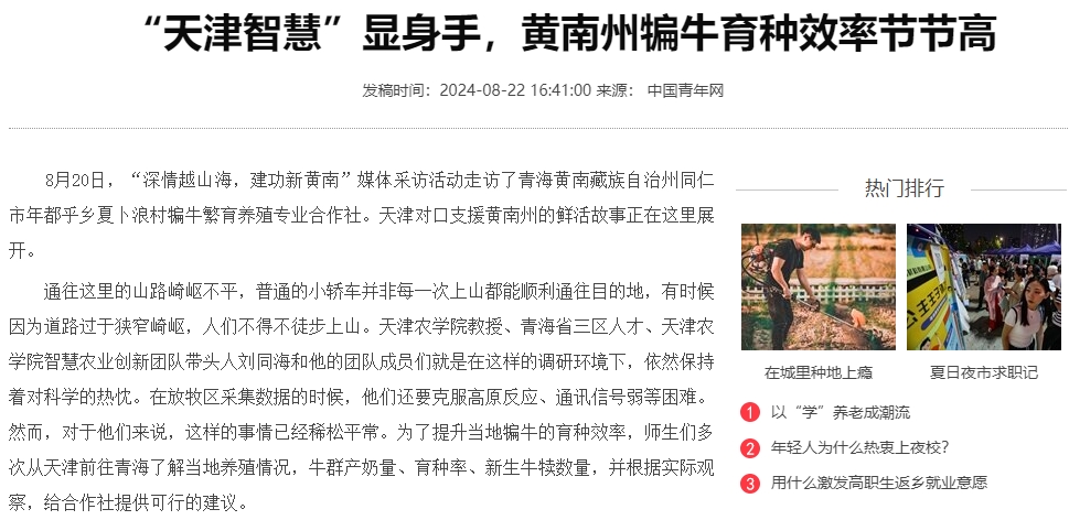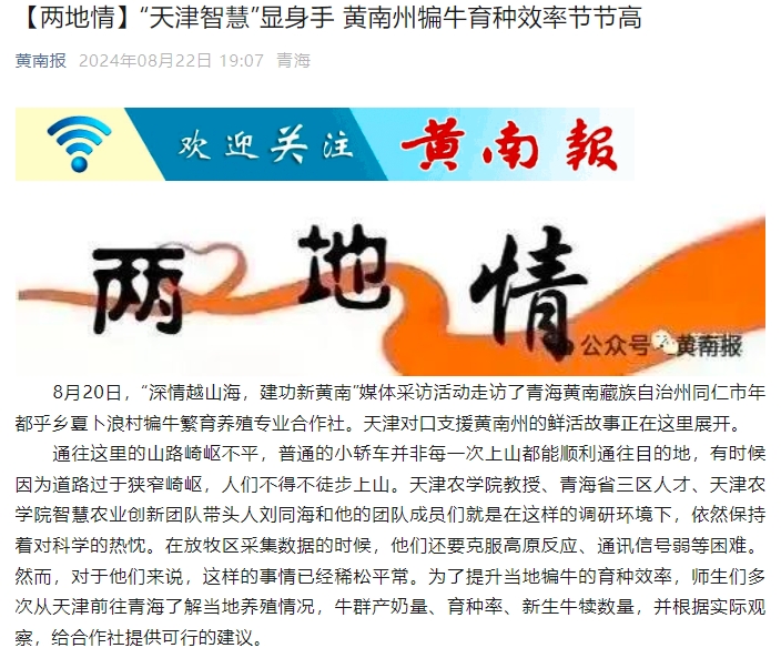 2024年8月22日,中国青年网、黄南报公众号报道365官网智慧农业创新团队负责人刘同海教授率团队骨干成员积极开展黄南州犏牛繁育智能化关键技术服务,助力当地百姓兴业致富,服务黄南州区域经济和科技发展。