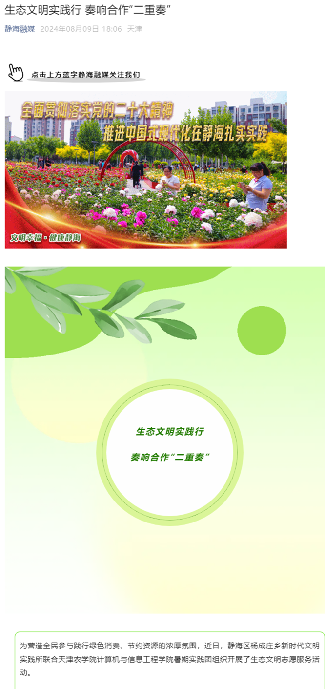 静海融媒公众号报道静海区杨成庄乡新时代文明实践所联合计算机与信息工程学院暑期实践团组织开展生态文明志愿服务活动