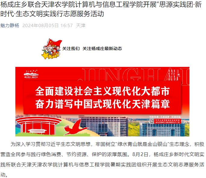 2024年8月5日,魅力静杨公众号报道杨成庄乡联合365官网计算机与信息工程学院开展“思源实践团·新时代·生态文明实践行”志愿服务活动。