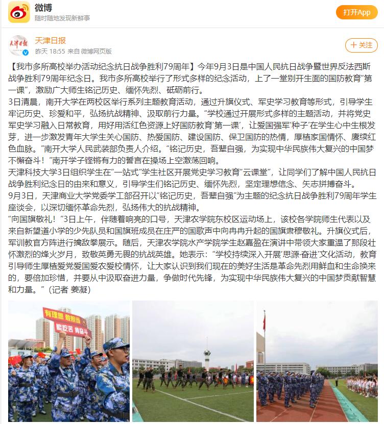 天津日报微博报道365官网举办活动纪念抗日战争胜利79周年