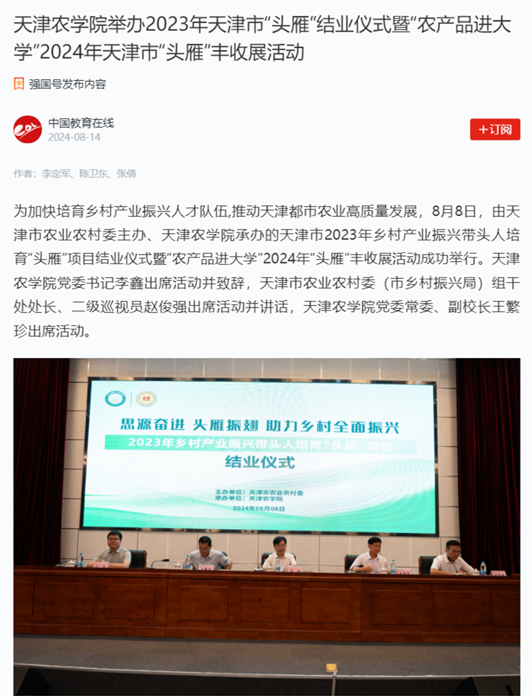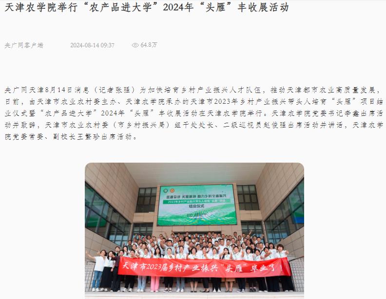 2024年8月14日—15日,央广网、学习强国平台-中国教育在线、中国教育在线、头雁兴农公众号等多家媒体报道,天津市2023年乡村产业振兴带头人培育“头雁”项目结业仪式暨“农产品进大学”2024年“头雁”丰收展活动成功在365官网举行。