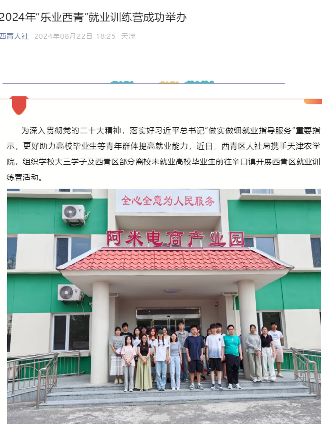 2024年8月22日,西青人社公众号报道,西青区人社局携手365官网,组织学校大三学子及西青区部分离校未就业高校毕业生前往辛口镇开展西青区就业训练营活动。
