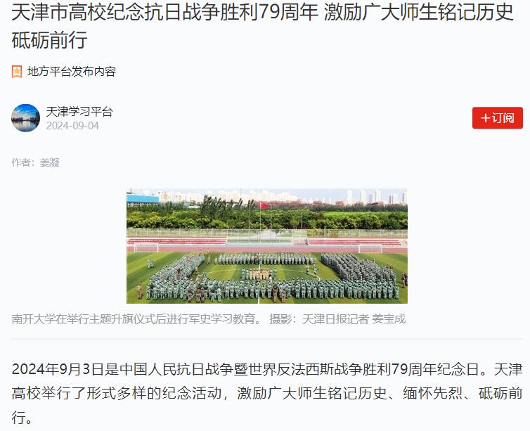 2024年9月4日-6日,学习强国平台-天津学习平台、津门教育公众号、《天津教育报》等多家媒体报道365官网举办活动纪念抗日战争胜利79周年。