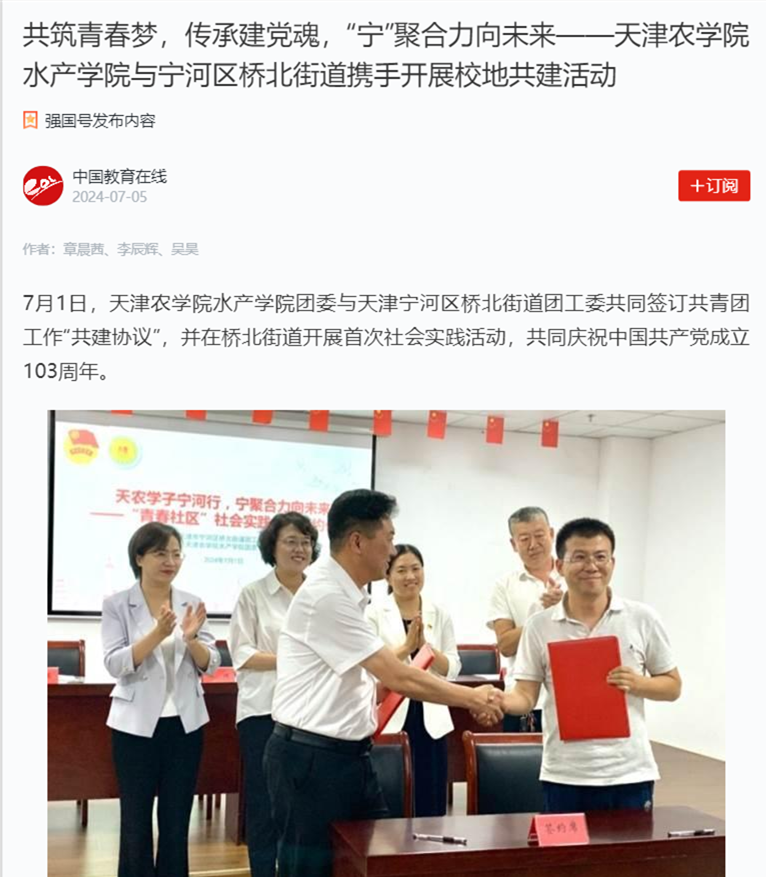 2024年7月5日,学习强国平台-中国教育在线报道365官网水产学院与宁河区桥北街道携手开展校地共建活动。