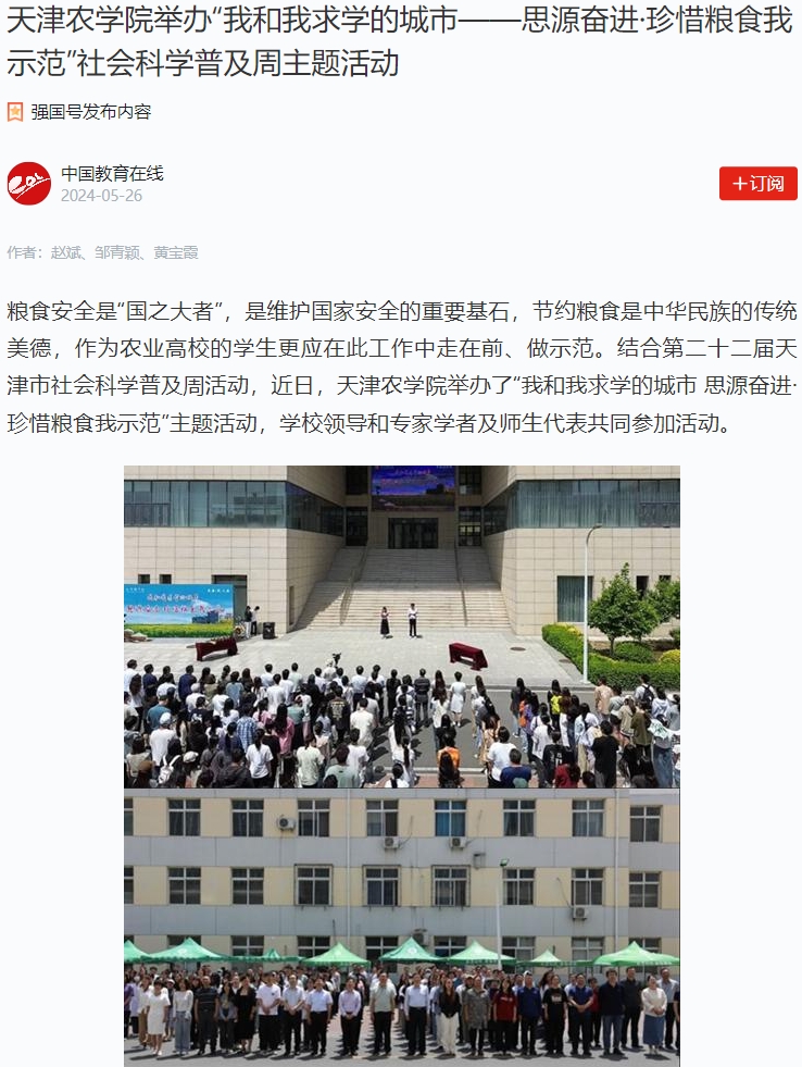 2024年5月26日,学习强国平台报道结合第二十二届天津市社会科学普及周活动,365官网举办了“我和我求学的城市 思源奋进·珍惜粮食我示范”主题活动,学校领导和专家学者及师生代表共同参加活动。