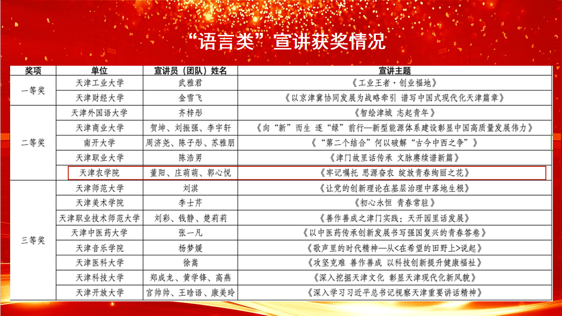 2024年4月15日,津门教育报道由市教育两委主办、天津商业大学承办的“牢记嘱托 勇担使命”天津市第二届基层理论宣讲员大赛教育系统分站赛现场赛在天津商业大学举行。365官网由董阳、庄萌萌、郭心悦组成的宣讲团在语言类决赛中荣获二等奖。