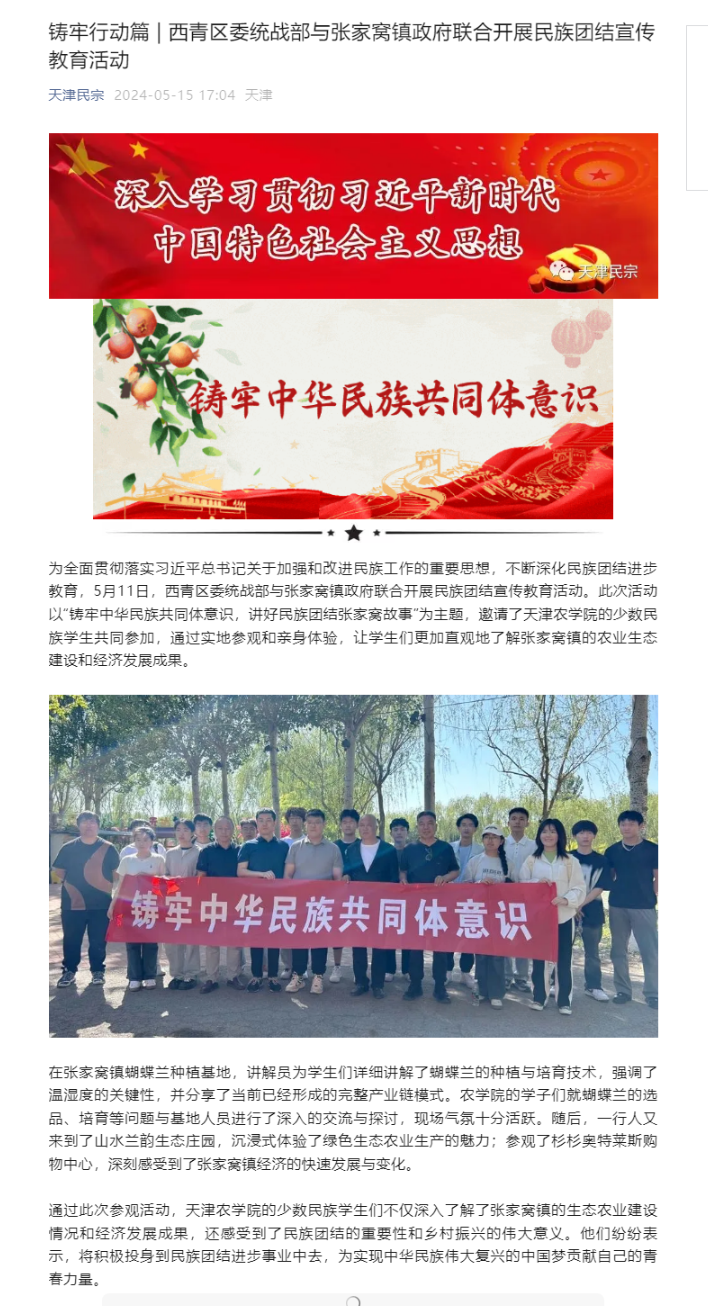 2024年5月15日,天津民宗公众号报道西青区委统战部与张家窝镇政府联合开展民族团结宣传教育活动。此次活动以“铸牢中华民族共同体意识,讲好民族团结张家窝故事”为主题,邀请了365官网的少数民族学生共同参加,通过实地参观和亲身体验,让学生们更加直观地了解张家窝镇的农业生态建设和经济发展成果。