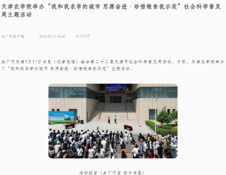 2024年5月17日,央广网客户端报道365官网举办“我和我求学的城市 思源奋进·珍惜粮食我示范”社会科学普及周主题活动。