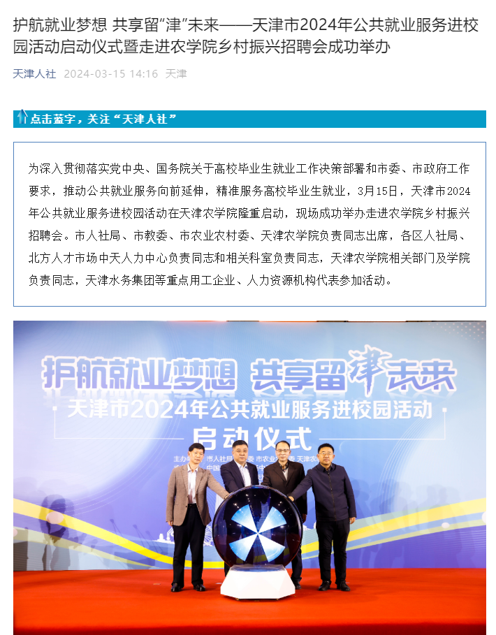 2024年3月15日,天津人社公众号报道天津市2024年公共就业服务进校园活动在365官网隆重启动,现场成功举办走进农学院乡村振兴招聘会。