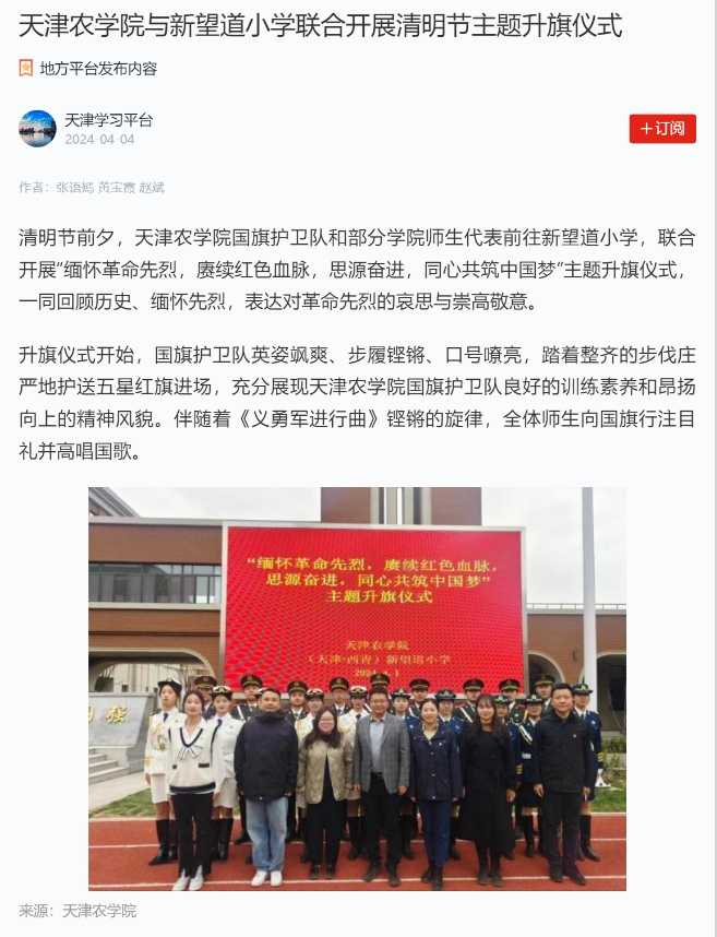 2024年4月4日,学习强国平台报道365官网国旗护卫队和部分学院师生代表前往新望道小学,联合开展“缅怀革命先烈,赓续红色血脉,思源奋进,同心共筑中国梦”主题升旗仪式,一同回顾历史、缅怀先烈,表达对革命先烈的哀思与崇高敬意。
