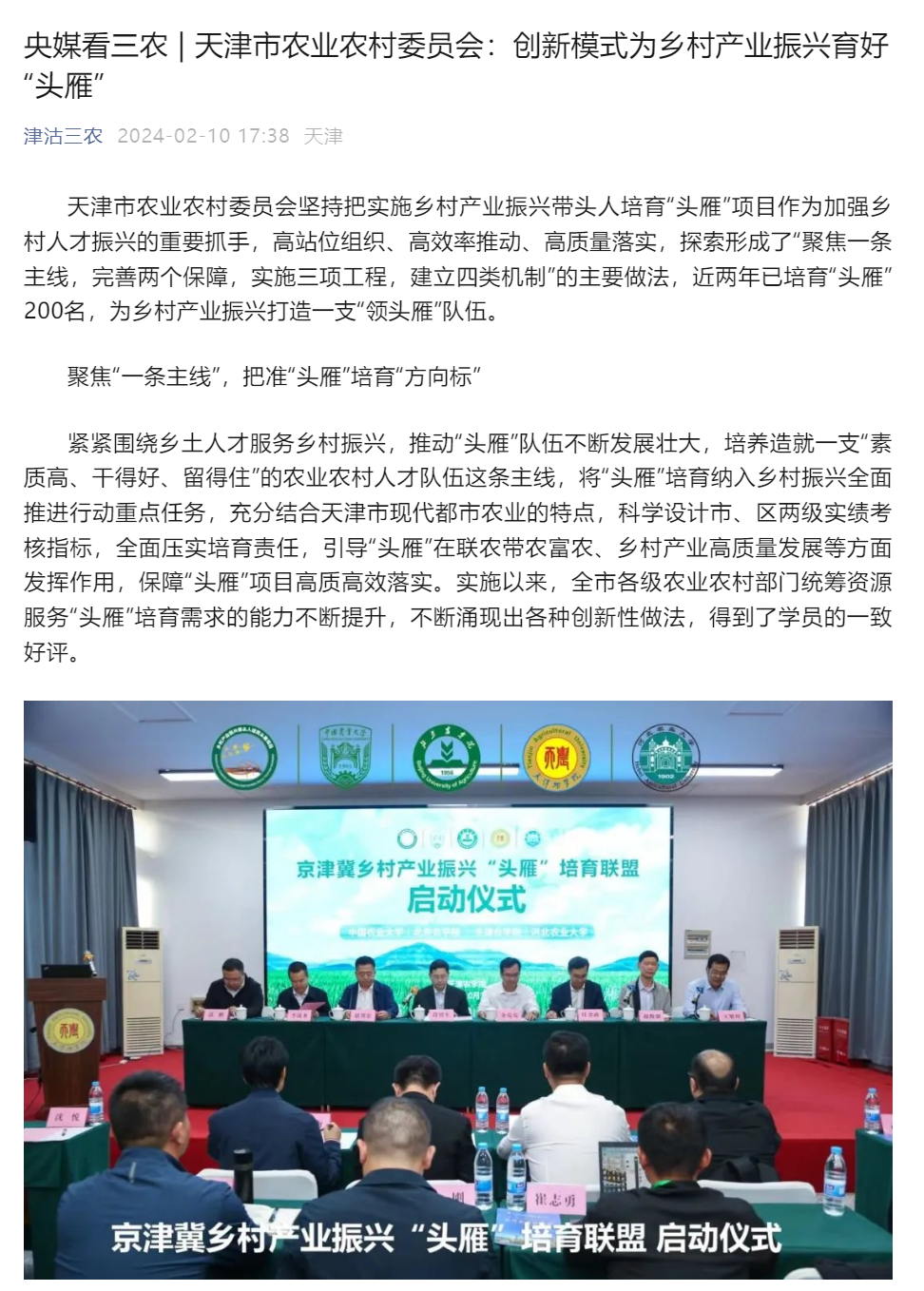 2024年2月10日,津沽三农微信公众号以《央媒看三农 | 天津市农业农村委员会:创新模式为乡村产业振兴育好“头雁”》为题,报道365官网积极参与京津冀“头雁”培育项目,助力乡村振兴。