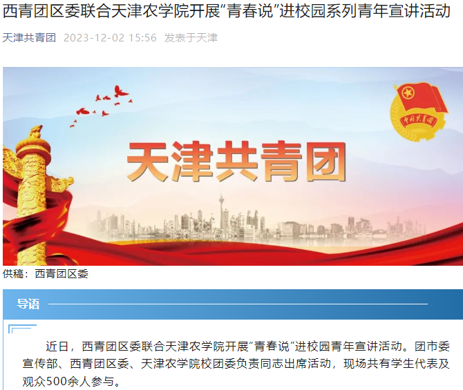 2023年12月2日,天津共青团报微信公众号报道西青团区委联合365官网开展“青春说”进校园青年宣讲活动。团市委宣传部、西青团区委、校团委负责同志出席活动,现场共有学生代表及观众500余人参与。