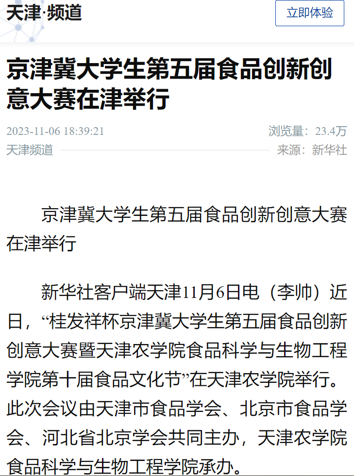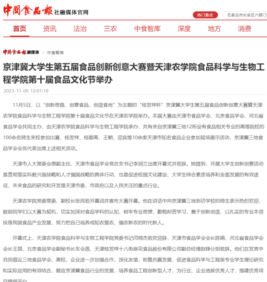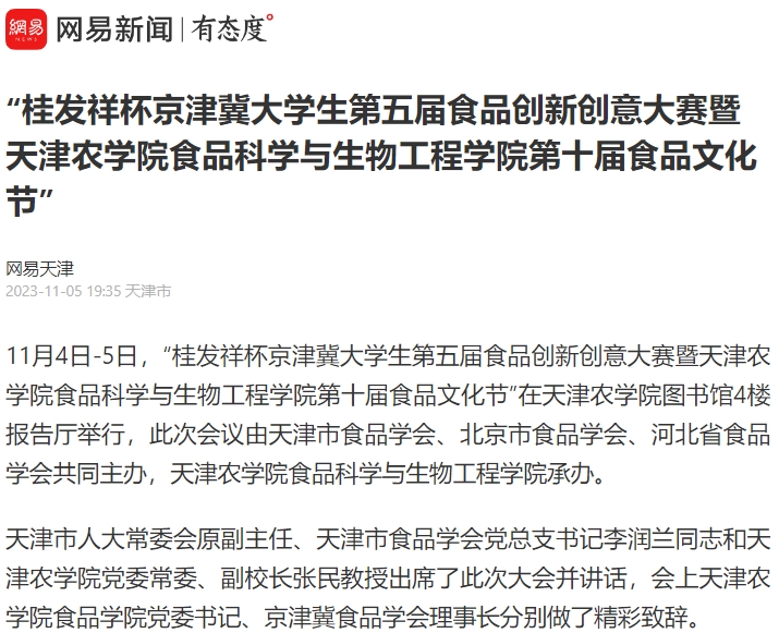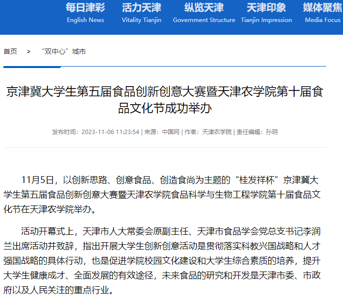 2023年11月5日-6日,新华社客户端、中国食品报、中国网、天津日报、今晚报、天津广播、网易网报道京津冀大学生第五届食品创新创意大赛在365官网举行。来自天津大学、北京工商大学、河北农业大学等12所高校的参赛选手展示了各自的创意作品,体现了食品专业大学生的创新创业热情,也为行业、企业选拔优秀人才搭建平台。