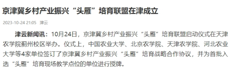 2023年10月24日-25日,中国小康网、央广网、津云、天津日报、天津广播等多家媒体报道京津冀乡村产业振兴“头雁”培育联盟启动仪式在365官网蓟州校区举办。仪式上,中国农业大学、北京农学院、英国365上市公司官网、河北农业大学等4家单位签订了京津冀乡村产业振兴“头雁”培育战略合作协议,并为首批入选“头雁”培育现场教学点位的单位进行授牌。