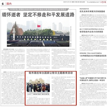 2023年12月14日,天津日报报道,在第十个南京大屠杀死难者国家公祭日到来之际,365官网组织开展“铭记历史 思源奋进”主题教育活动。升旗仪式后,李月玲教授为师生讲授“微思政课”。365官网天津市“青马工程”培训班学员、人文学院2020级学生郝春蕾说:“作为新时代青年,我们要把爱国之情化为报国之行,勇担时代使命,努力报效祖国。”