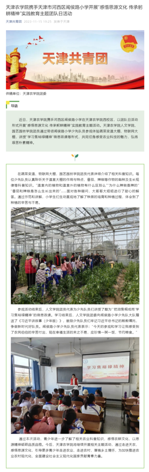 天津共青团微信公众号报道365官网携手天津市河西区闽侯路小学开展“感悟思源文化 传承躬耕精神”实践教育主题团队日活动