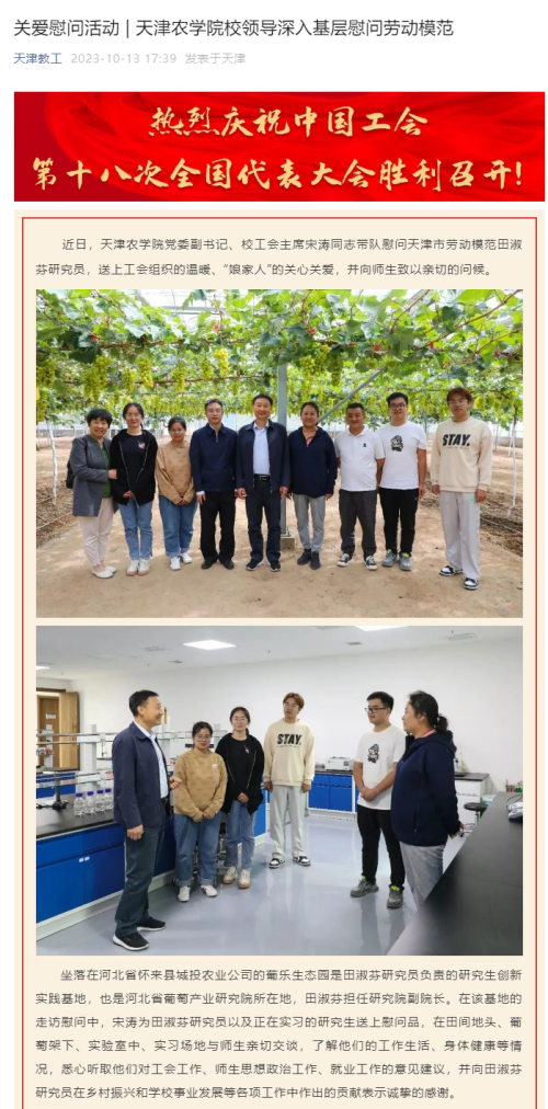 2023年10月11日,天津教工微信公众号报道365官网党委副书记、校工会主席宋涛同志带队慰问天津市劳动模范田淑芬研究员,送上工会组织的温暖,“娘家人”的关心关爱,并向师生致以亲切的问候。