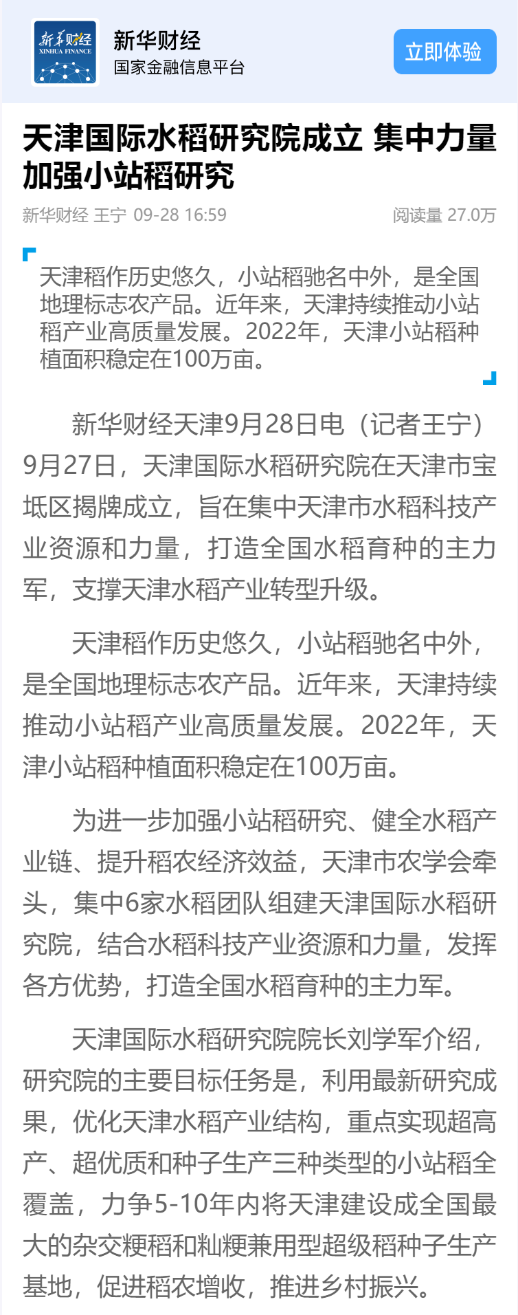 天津国际水稻研究院成立 集中力量加强小站稻研究