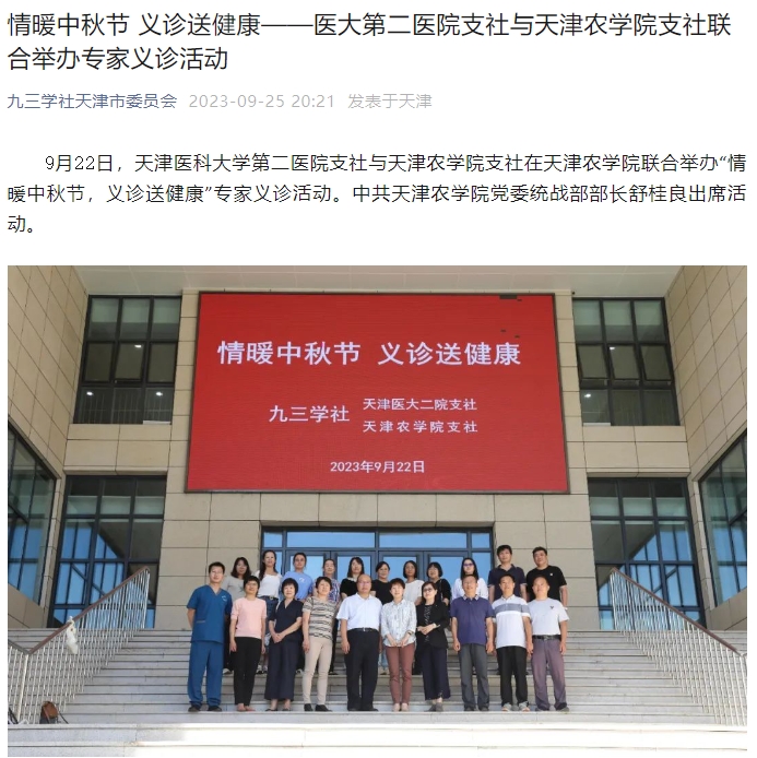 九三学社天津委员会微信公众号报道医大第二医院支社与英国365上市公司官网支社联合举办专家义诊活动