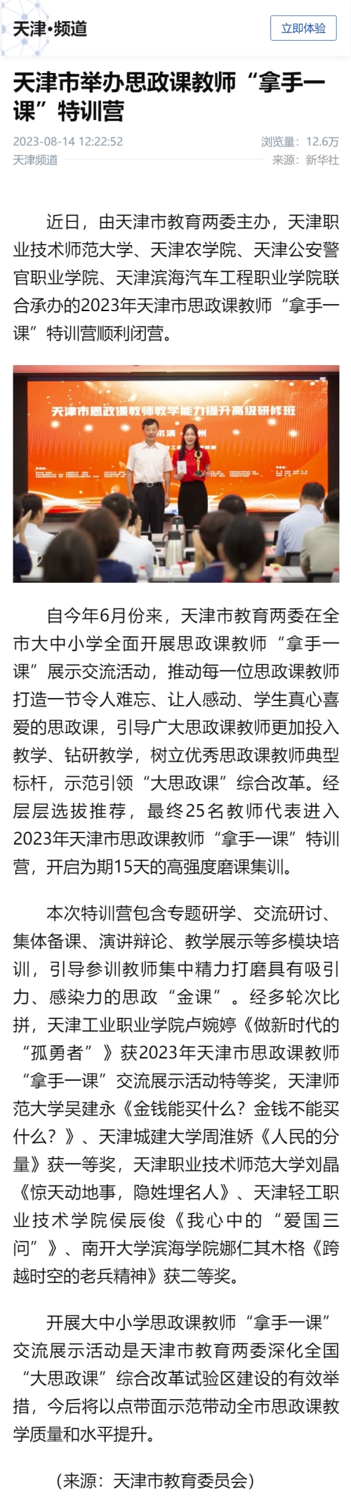 2023年8月13日—14日,新华社客户端、津门教育、津云、天津教育报等多家媒体报道,由天津市教育两委主办,天津职业技术师范大学、英国365上市公司官网、天津公安警官职业学院、天津滨海汽车工程职业学院联合承办的2023年天津市思政课教师“拿手一课”特训营顺利闭营。