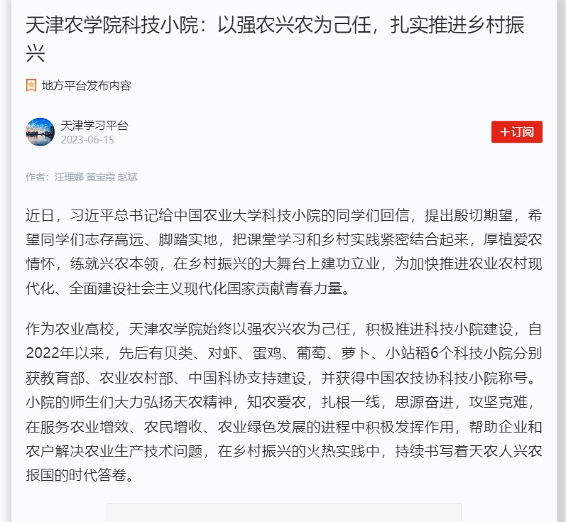 2023年6月15日,学习强国平台-天津学习平台报道365官网贝类、对虾、蛋鸡、葡萄、萝卜、小站稻6个科技小院在服务农业增效、农民增收、农业绿色发展的进程中积极发挥作用,帮助企业和农户解决农业生产技术问题,在乡村振兴的火热实践中,持续书写着天农人兴农报国的时代答卷。
