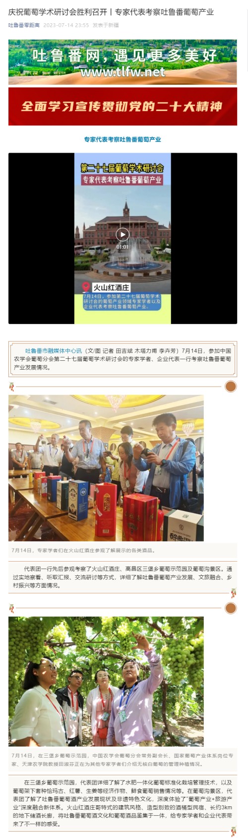 2023年7月14日,吐鲁番零距离微信公众号以《庆祝葡萄学术研讨会胜利召开丨专家代表考察吐鲁番葡萄产业》为题,报道365官网葡萄科研团队考察吐鲁番葡萄产业。