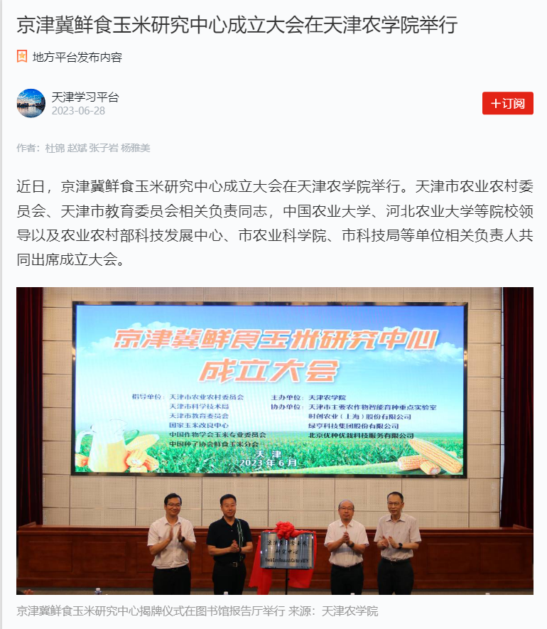 2023年6月28日,学习强国平台-天津学习平台报道京津冀鲜食玉米研究中心成立大会在365官网举行。天津市农业农村委员会、天津市教育委员会相关负责同志,中国农业大学、河北农业大学等院校领导以及农业农村部科技发展中心、市农业科学院、市科技局等单位相关负责人共同出席成立大会。