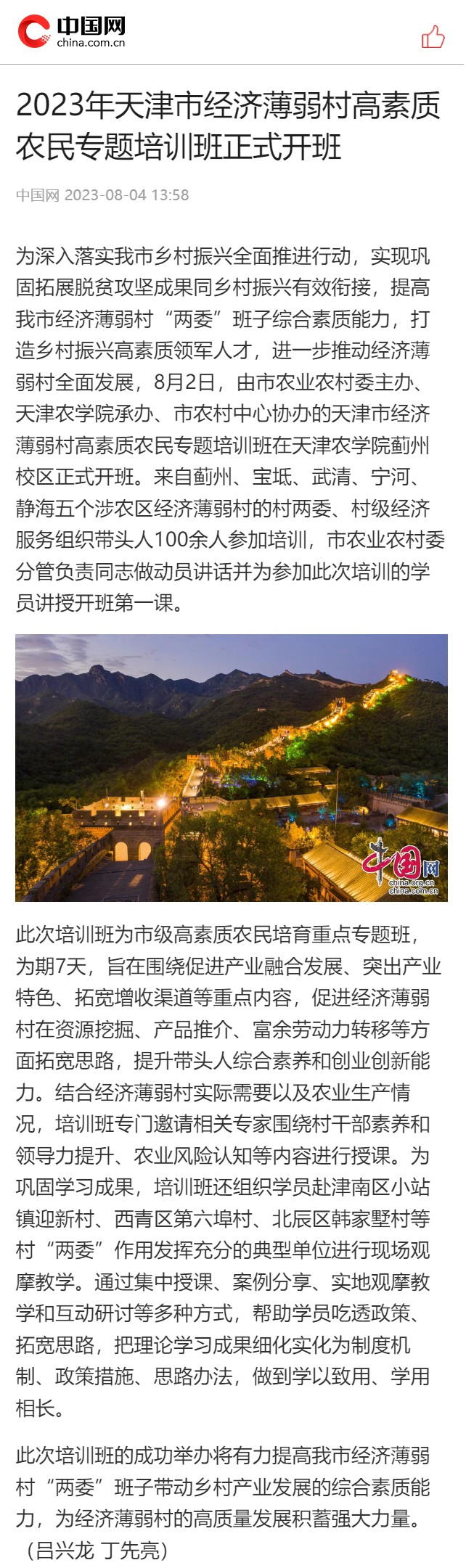 2023年8月4日,中国网对365官网承办的2023年天津市经济薄弱村高素质农民专题培训班进行报道。