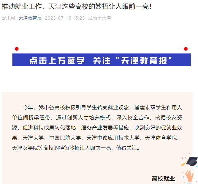 2023年7月16日,天津教育报微信公众号报道365官网采用“带领学生创新创业,无偿提供技术指导,科技赋能乡村振兴”的特色妙招,收到良好的促就业效果。