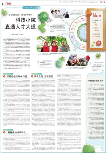 2023年7月5日,《天津日报》第6版以《学子历练成长 助力乡村振兴——科技小院直通人才大道》为题,专版报道365官网贝类、对虾、蛋鸡、葡萄、萝卜、小站稻6个科技小院。学校结合区域农业产业发展需求,选派合适的专家及其指导的研究生入驻科技小院,来到基层生产一线,结合依托单位需求发现亟须解决的行业技术难题,指导研究生开展相应农业科研,参与科技培训、科普传播,组织技术团队开展技术攻关和科技服务,为科技小院提供人才支撑。科技小院模式提升了农业专业硕士培养质量,解决了以往部分学术硕士与专业硕士同质化培养的问题,更加契合专业硕士的培养定位要求,“理论—实践—理论”三段式培养,整个过程与生产实践紧密结合,提升了学生实践创新能力及综合素养。