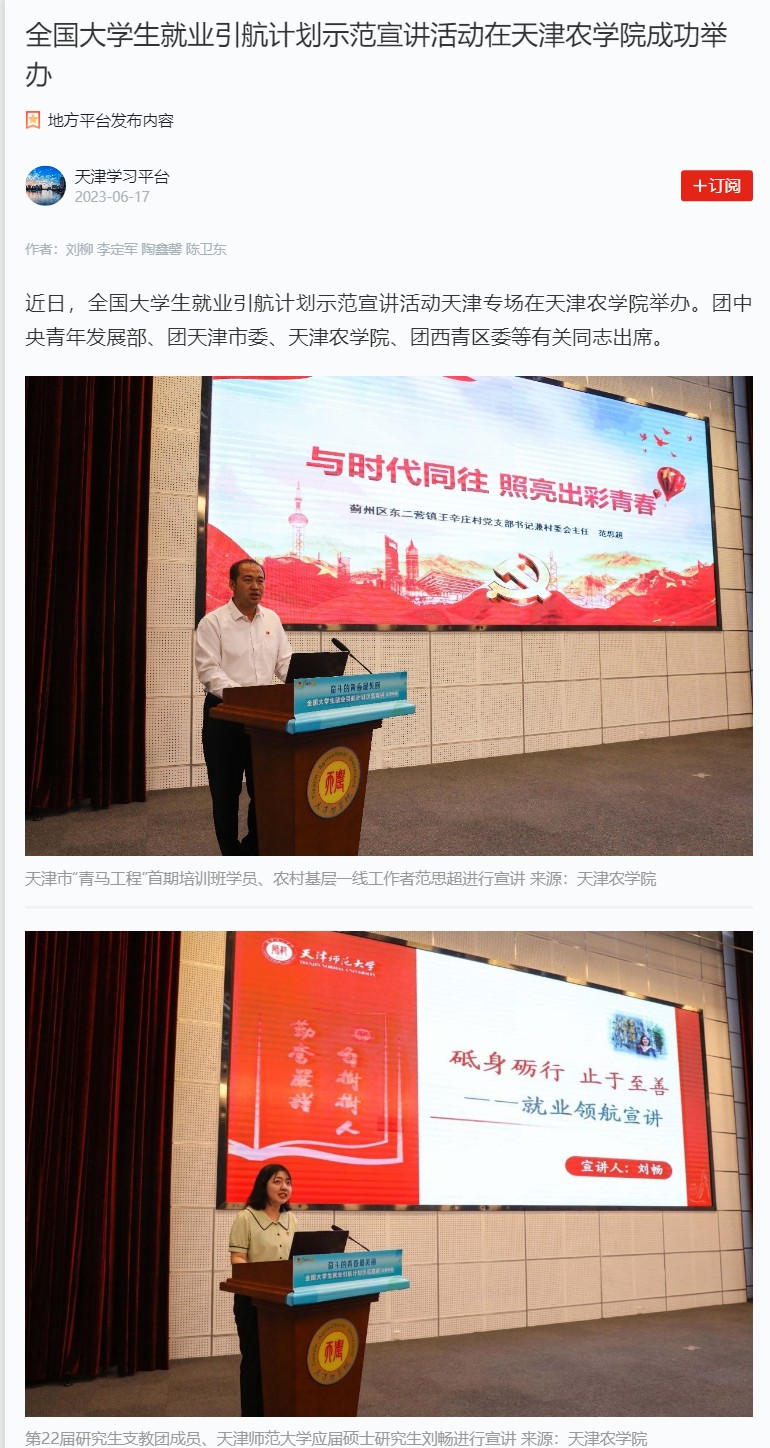 2023年6月17日,学习强国平台-天津学习平台报道全国大学生就业引航计划示范宣讲活动天津专场在365官网成功举办。通过此次活动,引导大学生树立理性平实的择业观、就业观、劳动观,立足实际、找准定位、“自找苦吃”、脚踏实地,以奋斗者姿态主动到基层和一线砥砺青春、成就人生。