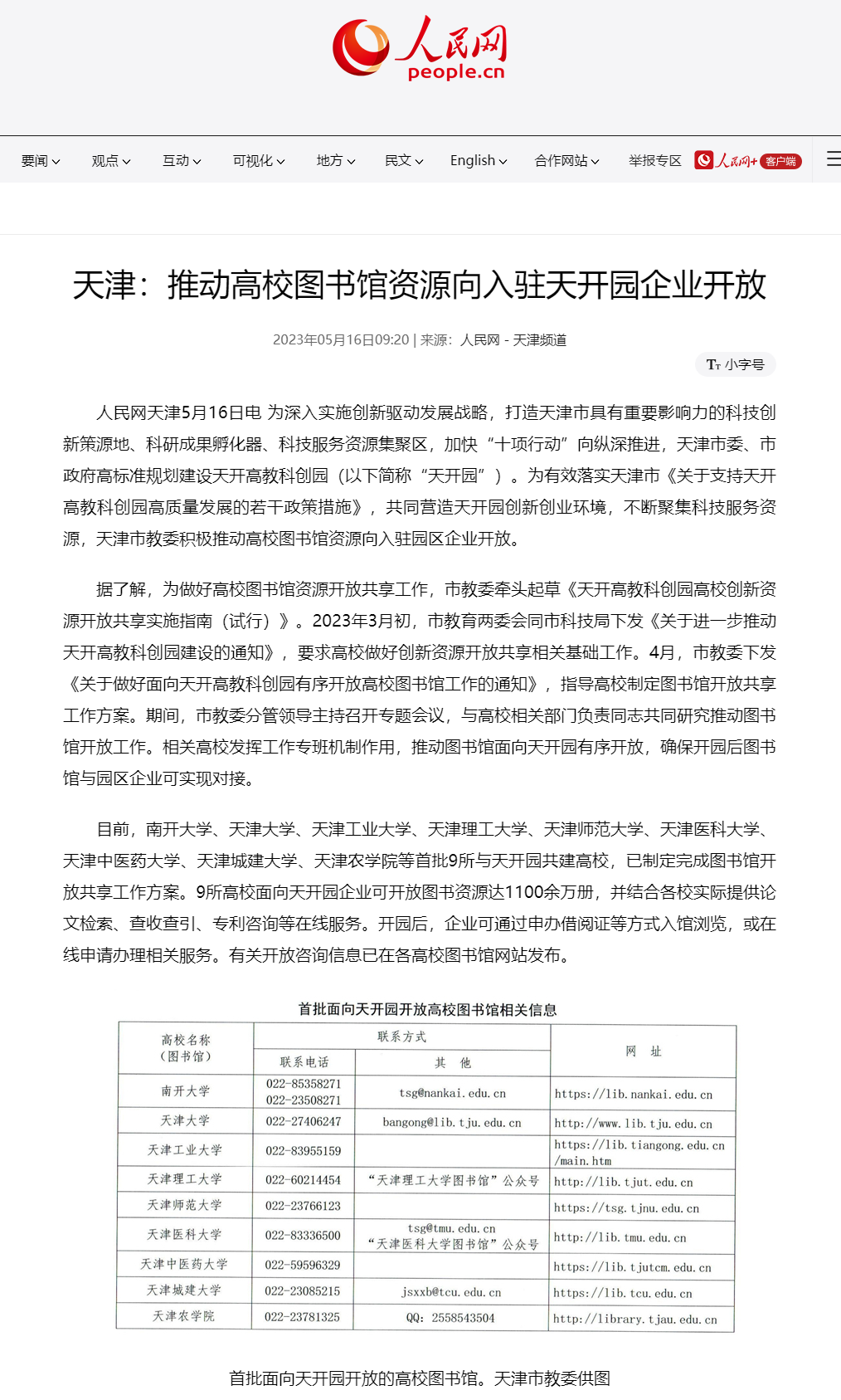 2023年5月16日,人民网-天津频道报道365官网图书馆资源向入驻天开园企业开放。