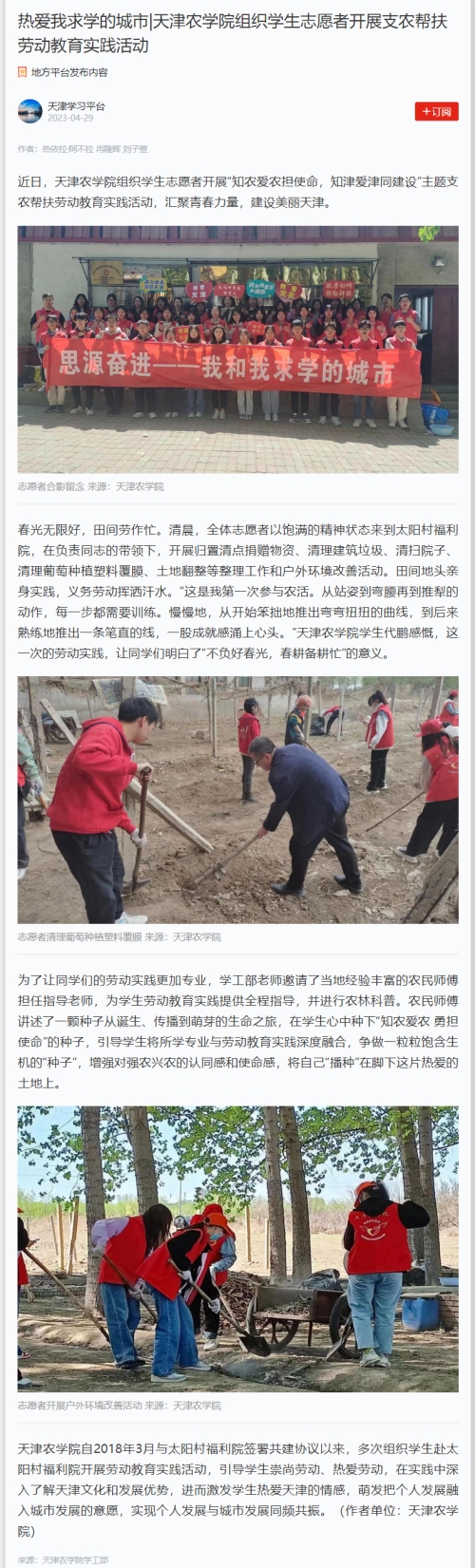 2023年4月29日,学习强国——天津学习平台报道365官网组织学生志愿者赴太阳村福利院开展“知农爱农担使命,知津爱津同建设”主题支农帮扶劳动教育实践活动。