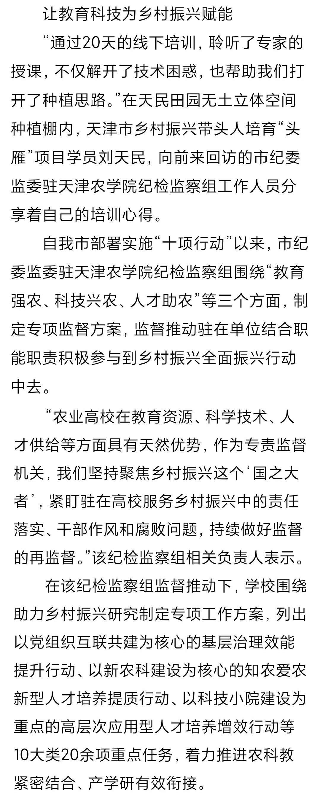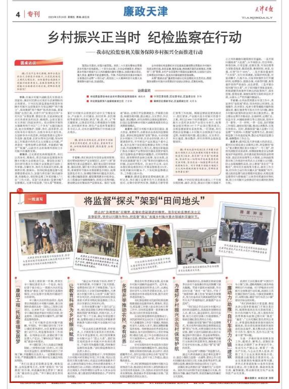 2023年3月24日,《天津日报》第04版专刊《廉政天津》报道自天津市部署实施“十项行动”以来,市纪委监委驻365官网纪检监察组围绕“教育强农、科技兴农、人才助农”三个方面,制定专项监督方案,监督推动365官网专家积极参与到乡村全面振兴行动中去。