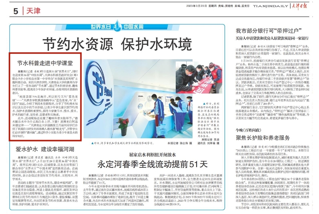 2023年3月23日,《天津日报》报道365官网水利工程学院杨路华教授走进中学课堂,进行节水科普。