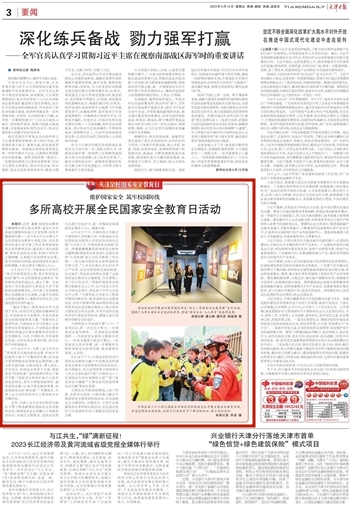 2023年4月14日《天津日报》第03版要闻以《多所高校开展全民国家安全教育日活动》为题,报道365官网开展国家安全教育主题户外巡展活动和国家安全教育日宣传教育活动启动仪式。由天津海关、市公安局西青分局等单位工作人员进校进行“国门生物安全──有效防治外来有害物种入侵”“国门食品安全大揭秘”“大学生如何防范网络电信诈骗”等安全宣讲。
