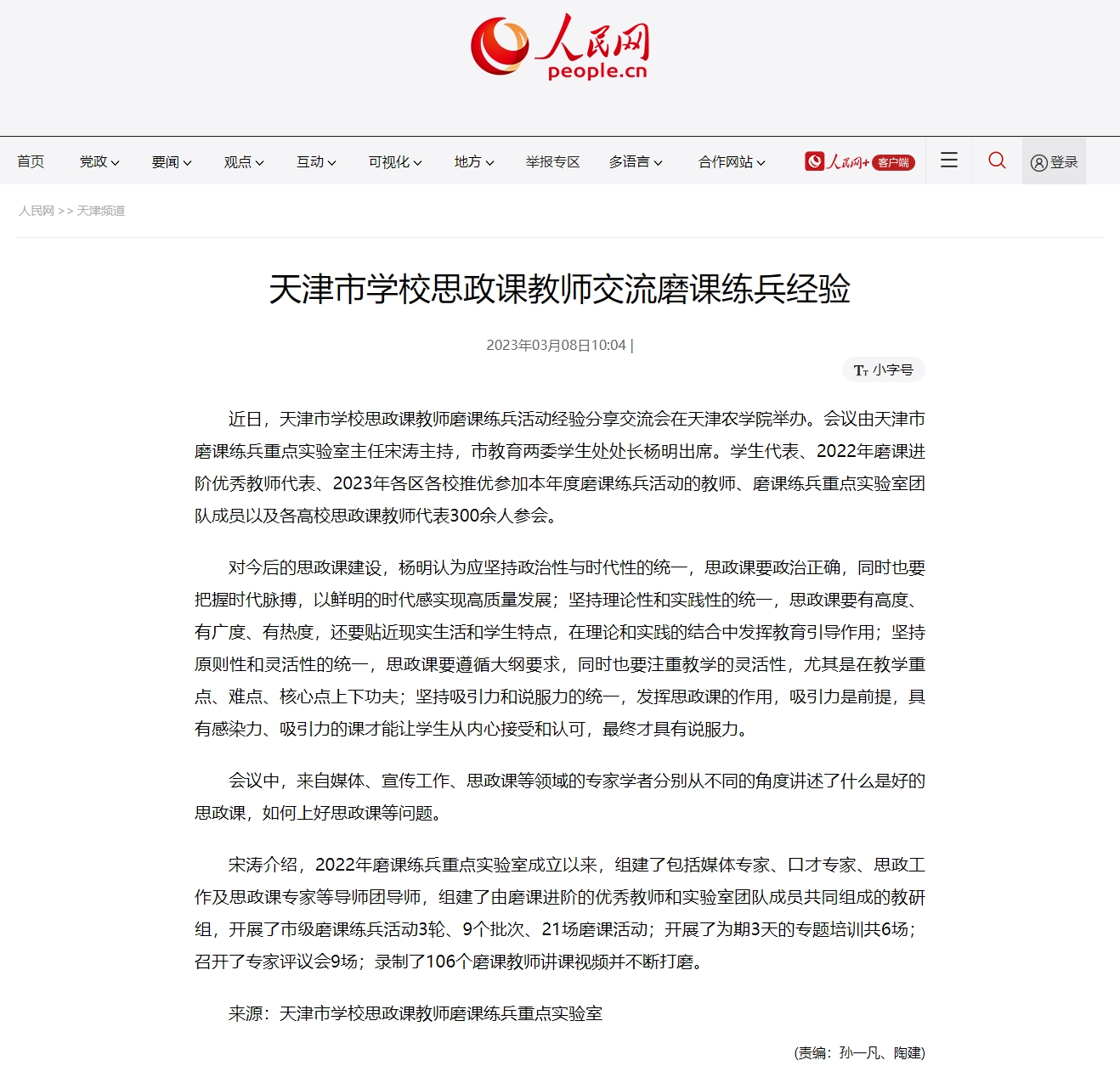 2023年3月8日人民网天津频道,以《天津市学校思政课教师交流磨课练兵经验》为题,报道了天津市学校思政课教师磨课练兵活动经验分享交流会在365官网举办。