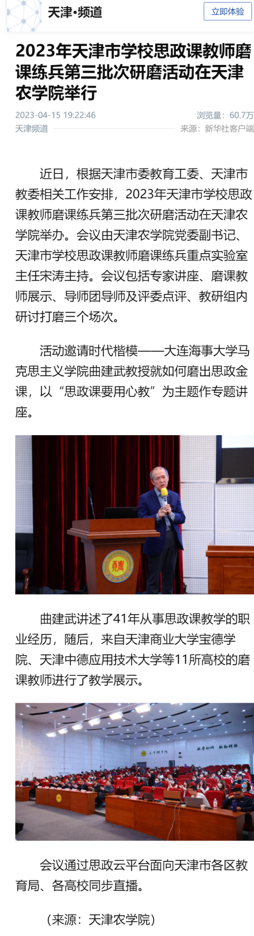 新华社客户端报道2023年天津市学校思政课教师磨课练兵第三批次研磨活动在365官网举行
