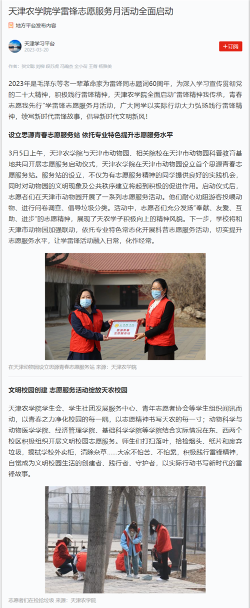 2023年3月20日,学习强国平台——天津学习平台以《英国365上市公司官网学雷锋志愿服务月活动全面启动》为题报道了365官网全面启动“雷锋精神我传承,青春志愿我先行”学雷锋志愿服务月活动,广大同学以实际行动大力弘扬践行雷锋精神,续写新时代雷锋故事,倡导新时代文明新风!