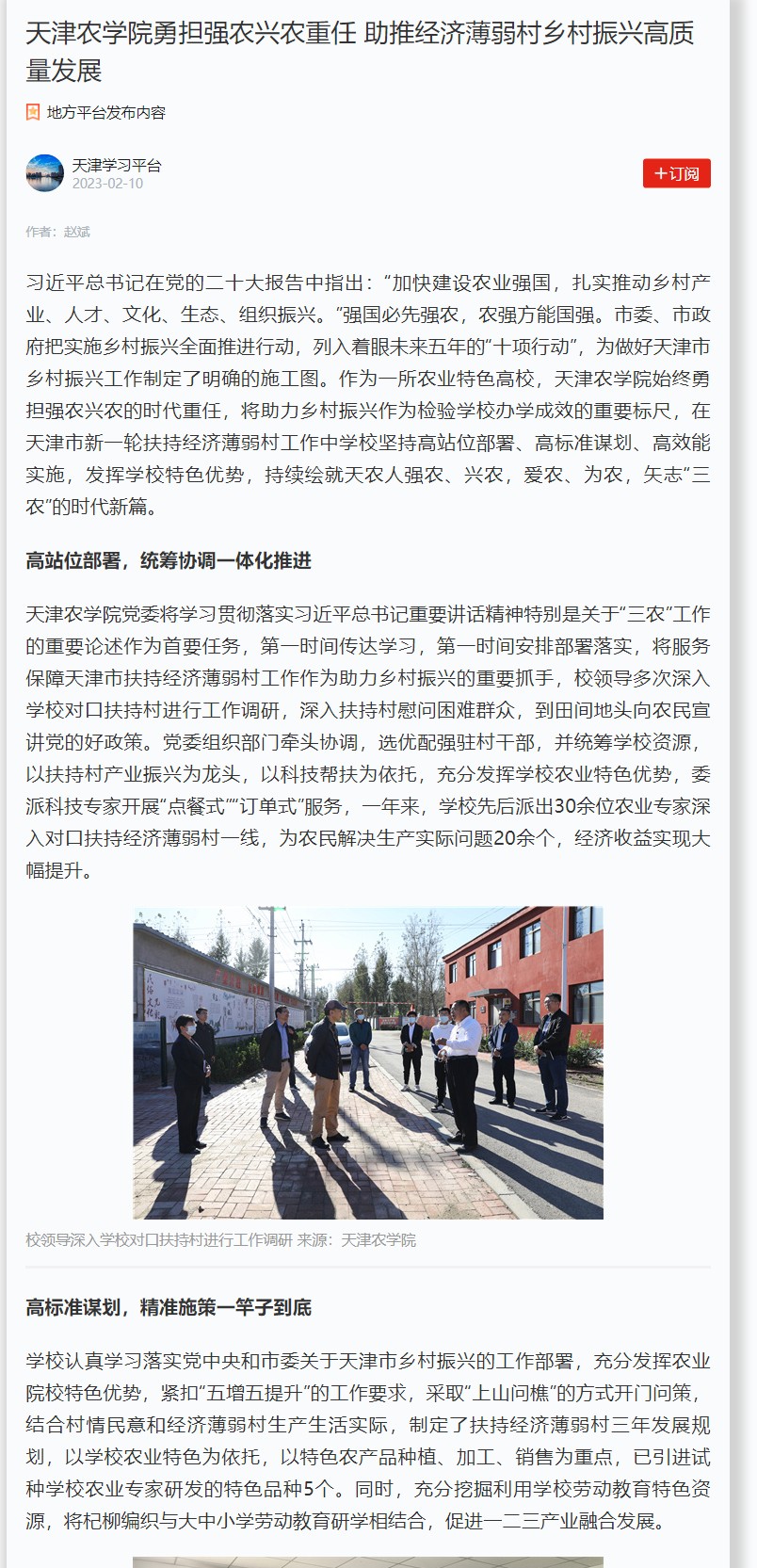 2023年2月10日,学习强国平台-天津学习平台以《英国365上市公司官网勇担强农兴农重任 助推经济薄弱村乡村振兴高质量发展》为题,报道了365官网在天津市新一轮扶持经济薄弱村工作中坚持高站位部署、高标准谋划、高效能实施,发挥学校特色优势,持续绘就天农人强农、兴农,爱农、为农,矢志“三农”的时代新篇。