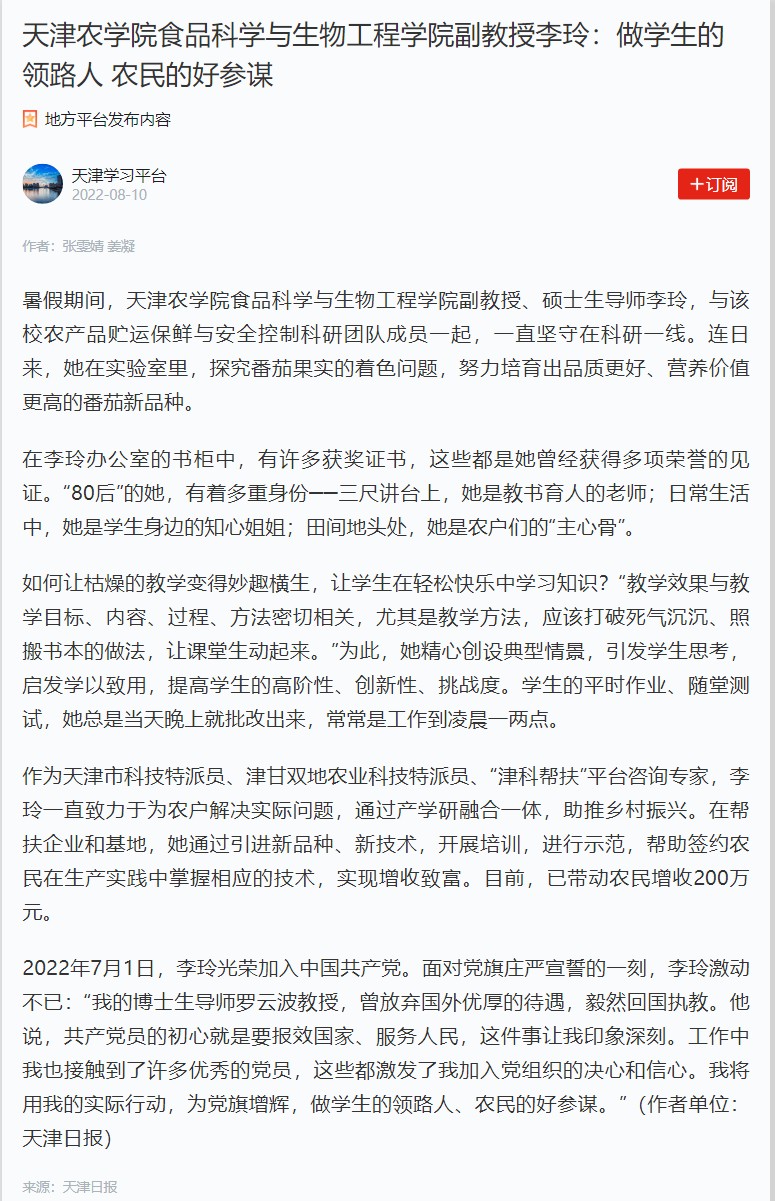 2022年7月1日,李玲光荣加入中国共产党。面对党旗庄严宣誓的一刻,李玲激动不已:“我的博士生导师罗云波教授,曾放弃国外优厚的待遇,毅然回国执教。他说,共产党员的初心就是要报效国家、服务人民,这件事让我印象深刻。工作中我也接触到了许多优秀的党员,这些都激发了我加入党组织的决心和信心。我将用我的实际行动,为党旗增辉,做学生的领路人、农民的好参谋。”(作者单位:天津日报)