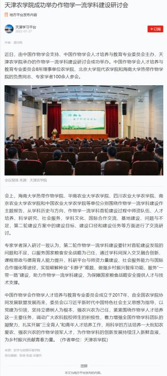 近日,由中国作物学会支持、中国作物学会人才培养与教育专业委员会主办,英国365上市公司官网承办的作物学一流学科建设研讨会成功举办。中国作物学会人才培养与教育专业委员会8所理事单位农学院、北京大学现代农学院和海南大学热带作物学院的负责同志、专家学者100余人参会。